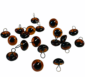Borostyán színű biztonsági üvegszem fűzőlyukkal a hátoldalán. Átmérője: 10 mm.