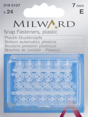 Áttetsző műanyag felvarrható patent. A csomag 24 pár patentet tartalmaz. Milward termék. Átmérője: 7mm