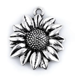 Napraforgó alakú, nem mágnesezhető fém medál, melyet dekorációs célokra, ruhadísznek ajánljuk. Mérete: 23x27 mm.