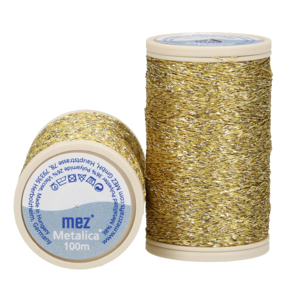 Fémszálas arany színű varrócérna. Műszálas összetételének köszönhetően rugalmas, ajánljuk gyapjúfilc díszek varrásához, díszítéshez. Összetétel: 38% fémes poliészter, 36% poliamid, 26% viszkóz . Hosszúság: 100m/tekercs. MEZ Metalica 4563000-00300