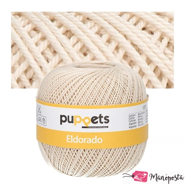 Puppets Eldorado 10- ecrü színű kiváló minőségű pamut horgolófonal. Finom szálból készült 100% pamut összetétellel. Egy gomobolyag 100 g-os kiszerelésben kapható. Hossza körülbelül 530 m, javasolt tűméret: 1.5mm - 1.75mm. A megvásárolt mennyiségnél, kérjük a gombolyagok számát adja meg.