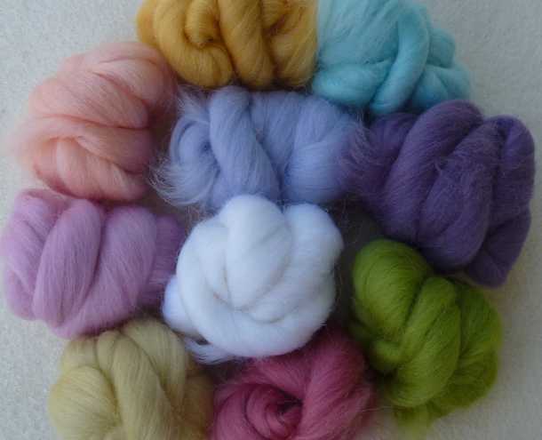 Pasztell színeket tartalmazó dél-amerikai merino szalaggyapjú csomag. Összetétele: világoszöld, fehér, opál, mályva, aranysárga, akáclila, orgona, barack, pasztellsárga és pasztellrózsaszín, a csomag színenként 10-10 grammot tartalmaz.
