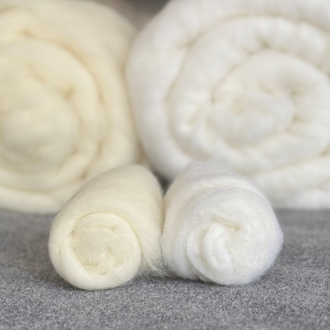 Bergschaf fehér és tejfehér paplangyapjú, illetve új-zélandi fehér és hófehér paplangyapjú.
