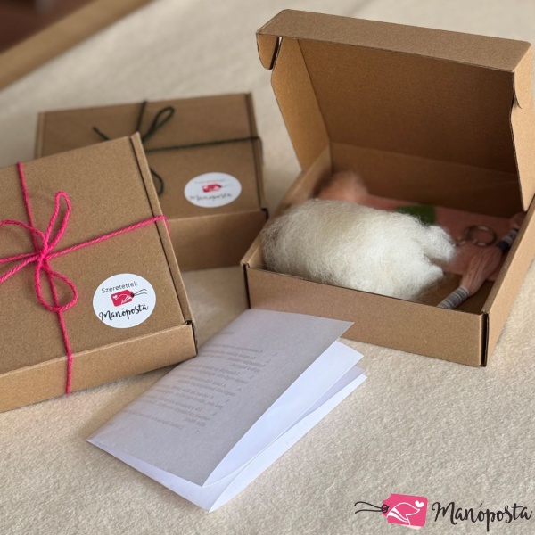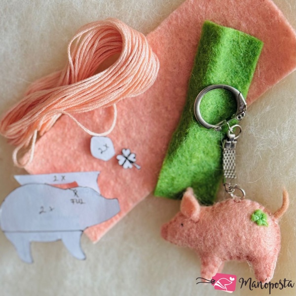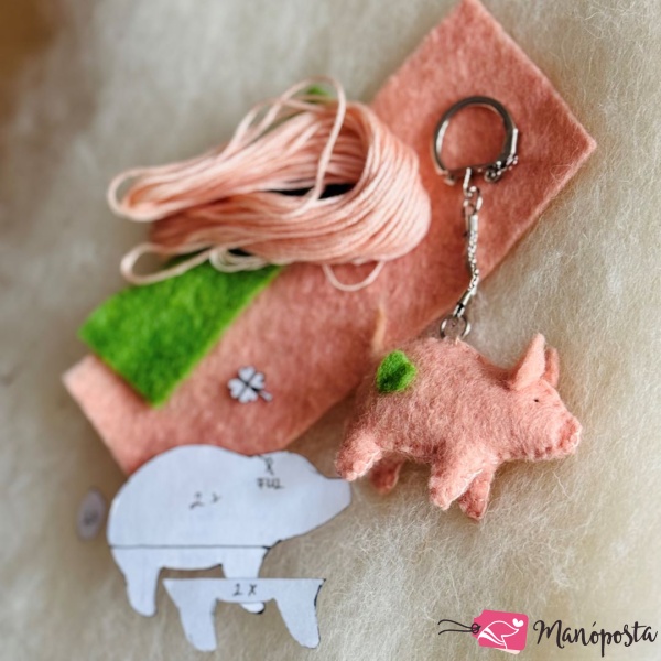 A csomag tartalma: A malac szabásmintája, színes gyapjúfilcek, tömőgyapjú a kitöméshez, bergschaf gyapjú a malac farkához, osztott hímzőfonal, kulcstartó alap, részletes leírás az elkészítéshez.
