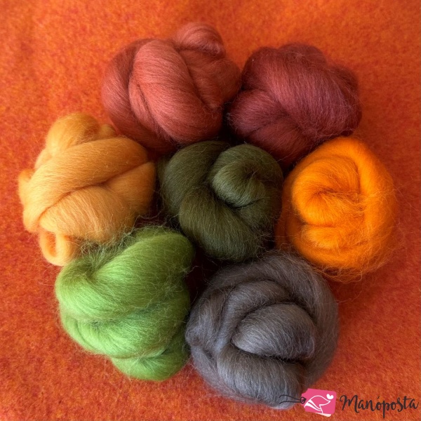 Őszi színeket tartalmazó dél-amerikai merino szalaggyapjú csomag. Összetétele: barna, világosnarancs, rozsda, róka, vadász, narancs, világoszöld. A csomag színenként 10-10 g gyapjút tartalmaz, összesen 70 g.