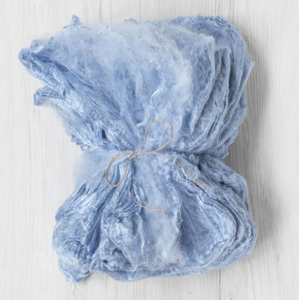 Nagyon finom, légies hatású, halványkék színű 25x25 cm nagyságú selyem zsebkendő, hankie, amely alkalmas nemezeléshez és fonáshoz egyaránt. Finom selyemszál, ami a selyemhernyó gubójának a kiterítésével készül. Nem szőtt termék.