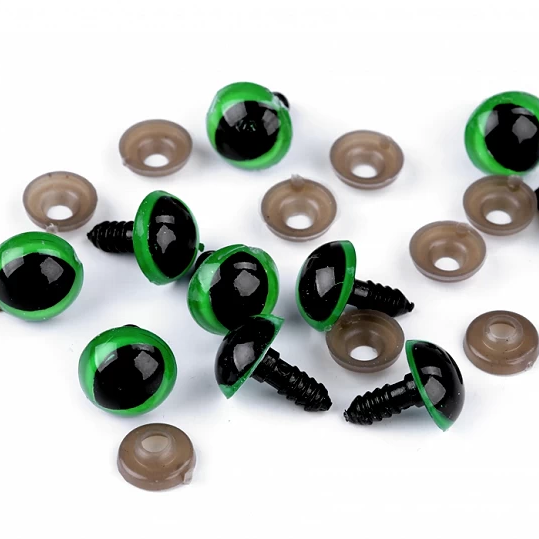 Élénkzöld színű 14 mm átmérőjű biztonsági cicaszem, amelyet tűnemezelt, textilből készült vagy horgolt figurák (állatok, babák) szemének az elkészítéséhet ajánlunk. A biztonsági szem hátoldalán menetes szár található, amelyet egy biztonsági patent segítségével lehet fixálni. Színe: élénkzöld és fekete, fényes. A csavar hossza 12 mm. Anyaga: műanyag. Átmérője 14 mm, hossza: 12 mm, vastagsága: 6 mm. Az egyszégcsomag 2 db szemet és 2 db biztonsági patentet tartalmaz. 3 éves kor alatti gyermeknek nem ajánlott! Használati utasítás: a szemet tegyék csúszásmentes felületre. A biztosítékot csipesszel tudják feltenni. A szem szárát húzzák át a textílián, a biztosítékot fogják meg csipesszel és csiptessék rá a szárra.