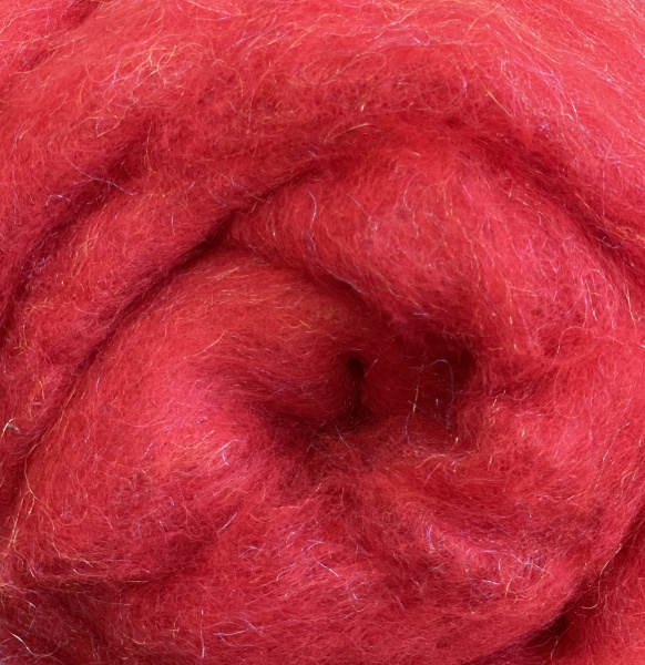 Csillogó szálakkal kártolt új-zélandi paplangyapjú, alapja piros színű, 10 g-os kiszerelésben. Szálfinomsága 27 mic.