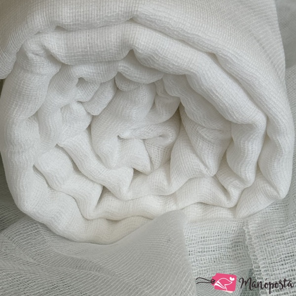 100% pamut, fehérített. Szélessége 90 cm. 1m géz = 20g.