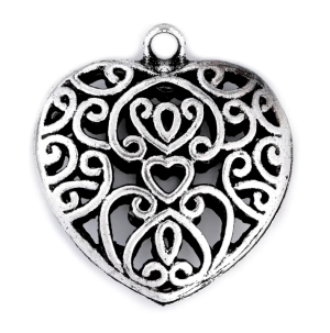 Szív alakú, kétoldalas, nem mágnesezhető fém medál, melyet dekorációs célokra, ruhadísznek ajánljuk. Mérete: 30x30 mm.