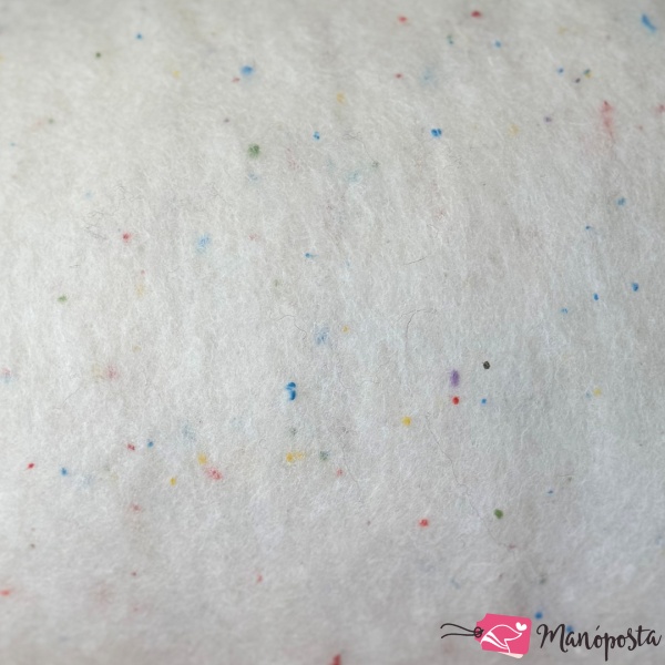 Fehér alapon színes pöttyös új-zélandi paplangyapjú 10g-os kiszerelésben, 27 micron.
