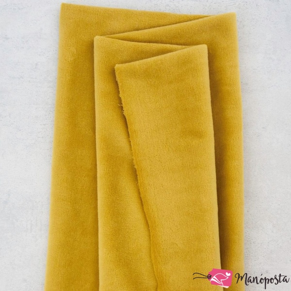 Olajsárga színű babaplüss anyag, 80% pamut, 20% PES összetételű. Az ár egy 35x50 cm-es darabra vonatkozik.