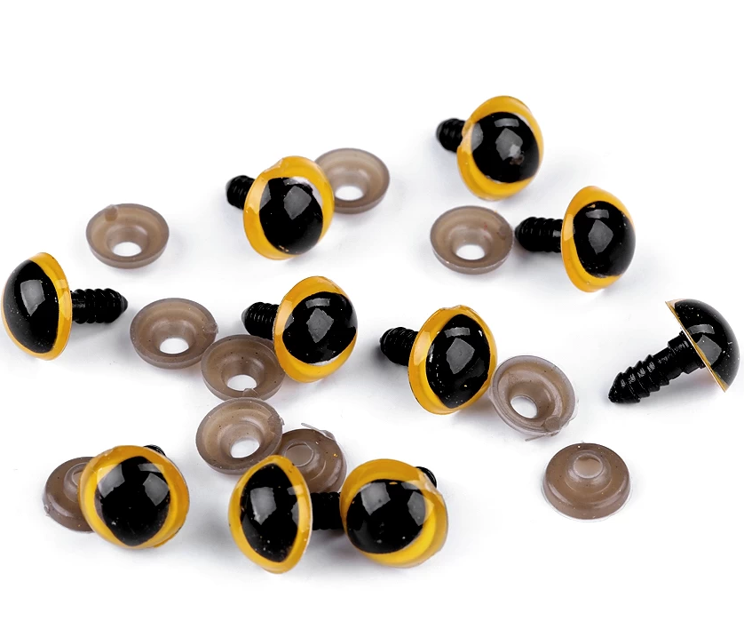 Borostyánsárga színű 14 mm átmérőjű biztonsági cicaszem, amelyet tűnemezelt, textilből készült vagy horgolt figurák (állatok, babák) szemének az elkészítéséhet ajánlunk. A biztonsági szem hátoldalán menetes szár található, amelyet egy biztonsági patent segítségével lehet fixálni. Színe: borostyánsárga és fekete, fényes. A csavar hossza 12 mm. Anyaga: műanyag. Átmérője 14 mm, hossza: 12 mm, vastagsága: 6 mm. Az egyszégcsomag 2 db szemet és 2 db biztonsági patentet tartalmaz. 3 éves kor alatti gyermeknek nem ajánlott! Használati utasítás: a szemet tegyék csúszásmentes felületre. A biztosítékot csipesszel tudják feltenni. A szem szárát húzzák át a textílián, a biztosítékot fogják meg csipesszel és csiptessék rá a szárra.