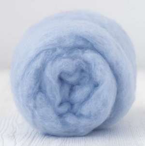 Sunrise-carded extra fine merino" Halványkék színű 19 micron szálfinomságú szalaggyapjú 10g-os kiszerelésben. Vizes és tűnemezeléshez egyaránt ajánljuk, szálfinomságának köszönhetően ruhák, sálak készítésére, és pontos illesztések létrehozására alkalmas. DHG termék.