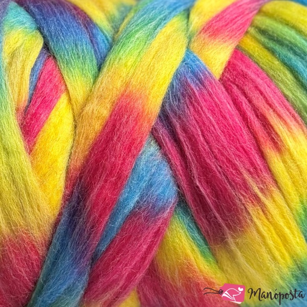 Szivárvány színű színátmenetes (ombria) merino szalaggyapjú 50g-os kiszerelésben. Szakaszosan festett, a színek váltakozva követik egymást. Kártolt, fésült kb. 24 micronos szalaggyapjú tű és vizes nemezeléshez. DHG termék.