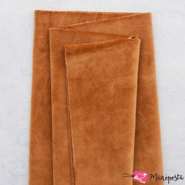 Fahéj színű babaplüss anyag, 80% pamut, 20% PES összetételű. Az ár egy 35x50 cm-es darabra vonatkozik.