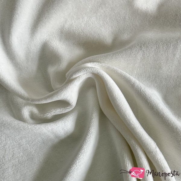 Tejfehér színű babaplüss anyag, 80% pamut, 20% PES összetételű. Az ár egy 30x50 cm-es darabra vonatkozik.